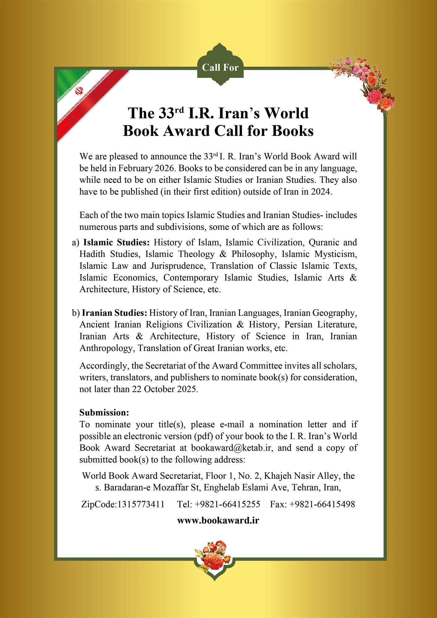 آیین پایانی سی و سومین جایزه جهانی کتاب سال جمهوری اسلامی ایران همزمان با دهه مبارک فجر در بهمن 1404 برگزار خواهد شد. از پژوهشگران، مولفان و مترجمان حوزه ایرانشناسی دعوت میشود در این رویداد شرکت کنند.