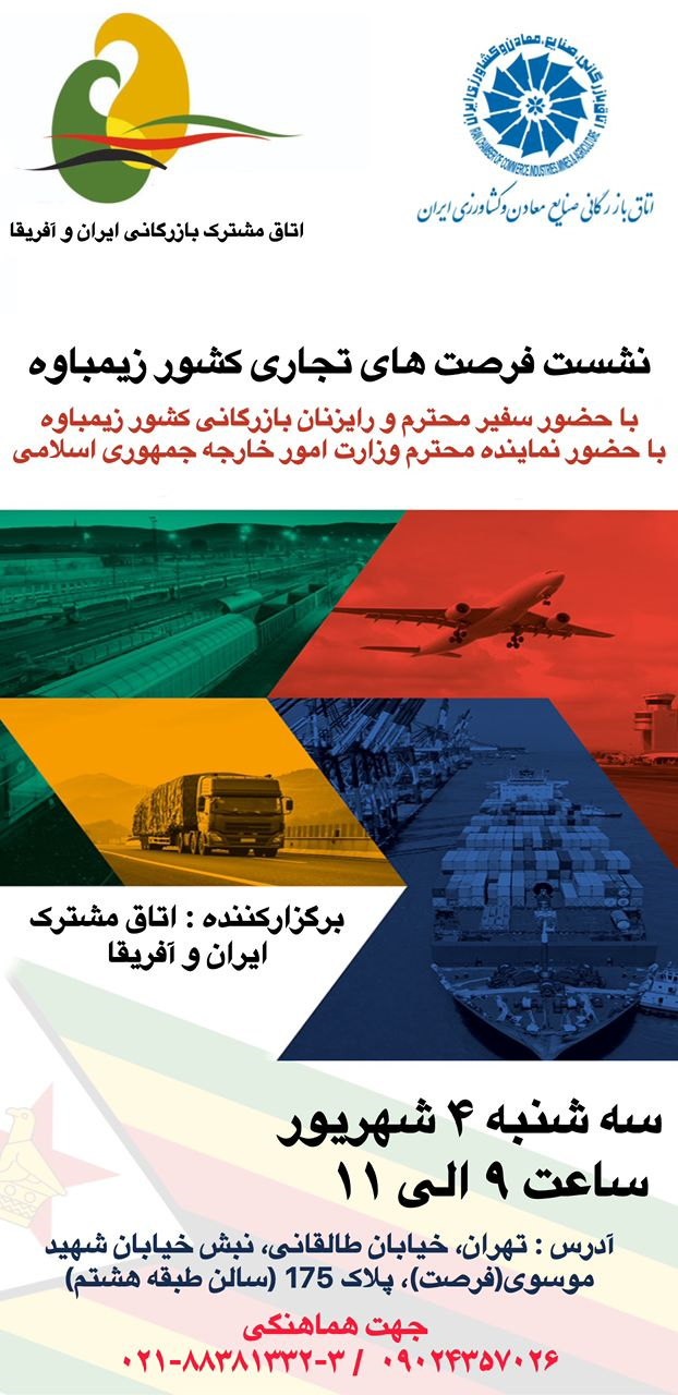 اتاق مشترک ایران و آفریقا با همکاری وزارت امورخارجه در 4 شهریور ماه نشست فرصت های تجاری کشور زیمبابوه را برگزار خواهد کرد. در این نشست سفیر و رایزن بازرگانی کشور زیمبابوه در ایران و نماینده وزارت امورخارجه شرکت خواهند نمود.