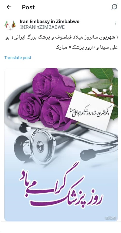 تبریک روز پزشک در شبکه ایکس سفارت جمهوری اسلامی ایران در زیمبابوه