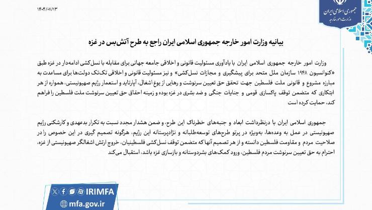 بیانیه وزارت امور خارجه جمهوری اسلامی ایران راجع به طرح آتش‌بس در غزه